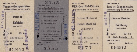 a) Rückfahrkarte Gesellschaftssonderzug 3. Klasse voller Preis ab Dortmund vom 23.02.1952, b) Rückfahrkarte Turnus-Gesellschaftssonderzug 2. Klasse voller Preis ab Hannover vom 03.09.1968, c) Turnus-Rückfahrkarte 2. Klasse voller Preis ab Hamburg vom 15.05.1970 und d) Rückkfahrkarte Turnus-Gruppenreise 2. Klasse voller Preis ab Frankfurt (Main) vom 19.08.1977.