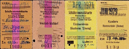 a) Schülermonatskarte im Wechselverkehr 2. Klasse aus Eichtersheim nach St Ilgen vom Apr/1971, b) Schülermonatskarte 2. Klasse aus Eichtersheim vom Mrz/1971, c) Schülermonatskarte Bus aus Eichtersheim vom Apr/1971 und d) Schülermonatskarte 2. Klasse aus Kandern vom Jun/1979.
