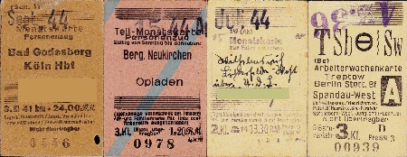 a) Monatskarte 3. Klasse aus Bad Godesberg (heute Bonn-Bad Godesberg) vom Sep/1944, b) Teilmonatskarte 3. Klasse aus Bergisch Neukirchen von der Woche 15/1944, c) Monatskarte 2. Klasse der Berliner S-Bahn, ausgegeben in Berlin Anhalter Bahnhof zur Fahrt zwischen Wilhelmsruh und Lichterfelde-West über U d L (Unter den Linden) vom Juli/1944 und d) Arbeiterwochenkarte 3. Klasse der Berliner S-Bahn, ausgegeben in Berlin Bellevue von der Woche 42/1936.