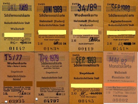 Ausgegeben am 19.08.1988 in Bruchsal für eine einfache Fahrt halber Preis für einen Taschengeld-Pass-Inhaber nach Aglasterhausen und b) am 02.04.1989 von Sinsheim nach Eschelbronn als Rückfahrkarte halber Preis für einen Seniorenpass-Inhaber.