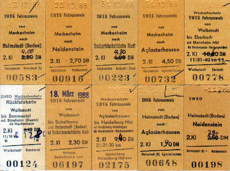 Die Deutsche Bundesbahn verkaufte ab 1982 keine edmondsonschen Fahrkarten im Wechselverkehr zur SWEG. Fahrkarten im Wechselverkehr wurden bei der DB entweder mit dem MOFA-System ausgegeben oder es wurden entsprechende Blankokarten verwendet. Auch sind mir keine fertiggedruckten Fahrkarten im Wechselverkehr bekannt, die vor 1982 zur Hüffenhardter Strecke gingen. Selbst bei den Schülerzeitkarten wurden dafür getrennte Fahrkarten ausgegeben. Auch bemerkenswert war es, dass es ab 1978 kaum noch Sammelfahrkarten gab, die auch noch Ziele der Strecke Meckesheim-Aglasterhausen beinhalteten.