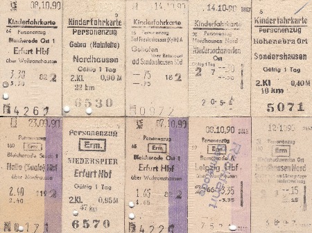 obere Reihe: Kinderfahrkarten für einfache Fahrt Personenzug aus a) Bleicherode Ost nach Erfurt Hbf vom 08.10.1990, b) Gebra (Hainleite) nach Nordhausen vom 08.10.1990, c) Bad Frankenhausen (Kyffh) nach Gehofen od Sondershausen Süd vom 14.10.1990, d) Nordhausen Nord nach Niedersachswerfen Ost vom 14.10.1990 und e) Hohenebra Ort nach Sondershausen vom 18.10.1990.