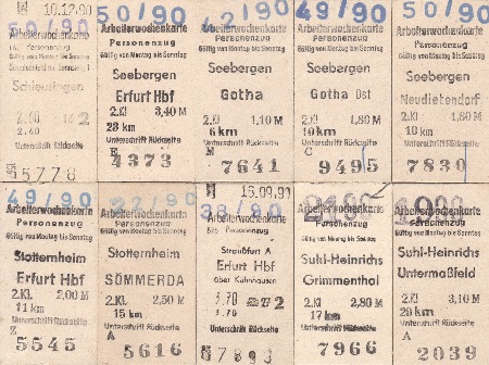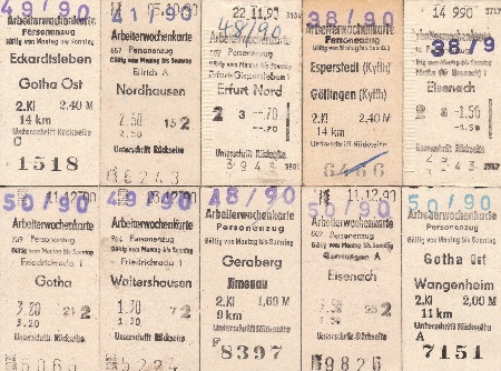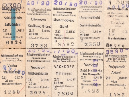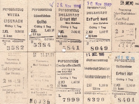 Einfache Fahrkarten voller Preis Personenzug aus f) Vacha nach Dietlas od Merkers vom 10.05.1990, g) Untermassfeld nach Meiningen vom 21.05.1990, h) Hedersleben-Wedderstedt nach Aschersleben od Ermsleben vom 22.05.1990, i) Stützerbach nach Martinroda od Schleusingen vom 28.05.1990 und j) Rennsteig nach Schmiedefeld a Rst vom 29.05.1990.
