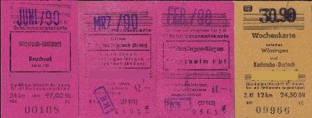 a) Schülerwochenkarte Bus/Schiene aus Wölfersheim-Södel von der Woche 46/1992, b) Monatskarte aus Wössingen ab dem 03.04.1991, c) Schülermonatskarte Bus/Schiene aus Wössingen vom Dez/1990 und d) Schülermonatskarte Bus/Schiene aus Wössingen vom Apr/1991.