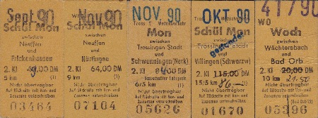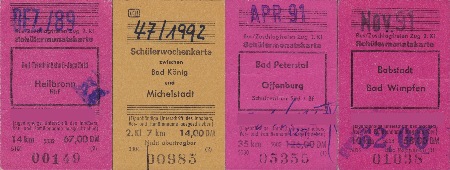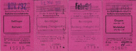 a) Monatskarte Bus/Schiene aus Kilianstädten ab dem 06.07.1992, b) Monatskarte Bus/Schiene aus Köppern ab dem 21.09.1992, c) Schülermonatskarte Bus/Schiene aus Kressbronn vom Dez/1993 und d) Schülermonatskarte Bus/Schiene aus Kressbronn vom Dez/1993.