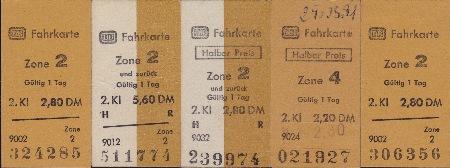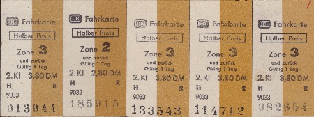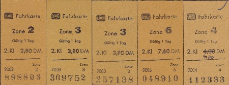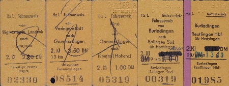 obere Reihe: Zonenorientierte einfache Fahrkarten halber Preis aus a) Ittlingen vom 18.05.89, b) Ittlingen vom 13.07.89, c) Kirchhain (Bz Kassel) vom 09.02.89, d) Leingarten vom 17.07.89 und e) Leingarten vom 29.05.89.