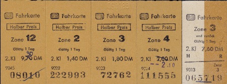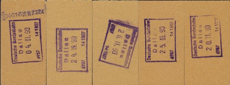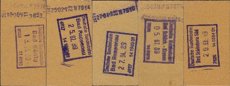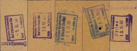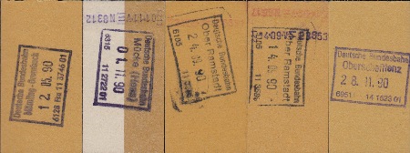 obere Reihe: Zonenorientierte Rückfahrkarten halber Preis aus a) Neustadt (Kr Marburg) vom 31.01.89, b) Richen (b Eppingen) vom 07.03.89, c) Rot-Malsch vom 21.03.89, d) Rot-Malsch vom 25.07.89 und e) Seckach vom 29.05.89.