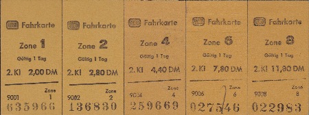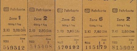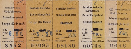 obere Reihe: Zonenorientierte einfache Fahrkarten voller Preis aus a) Oberschefflenz vom 01.09.89, b) Oberschefflenz vom 02.09.89, c) Pfeddersheim vom 09.11.89, d) Pfeddersheim vom 09.11.89 und e) Pfeddersheim vom 20.10.89.