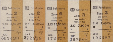 obere Reihe: Zonenorientierte einfache Fahrkarten halber Preis aus a) Tauberbischofsheim vom 28.02.89, b) Walldürn vom 03.07.89, c) Wetter (Hess-Nass) vom 05.01.89, d) Wössingen vom 02.07.89 und e) Zonenorientierte Rückfahrkarte voller Preis aus Adelsheim Ost vom 09.05.89.