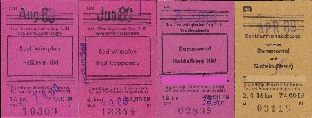 obere Reihe: Zonenorientierte Rückfahrkarten halber Preis aus a) Bad Schönborn Süd vom 21.03.89, b) Bad Wimpfen vom 11.05.89, c) Bammental vom 05.07.89, d) Bammental vom 29.07.89 und e) Birkenau vom 23.06.89.