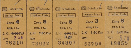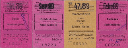 obere Reihe: Zonenorientierte einfache Fahrkarten halber Preis aus a) Eppingen vom 17.07.89, b) Eppingen vom 23.02.89, c) Erbach (Odenw) vom 10.03.89, d) Erbach (Odenw) vom 31.07.89 und e) Gemmingen vom 14.03.89.