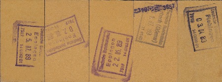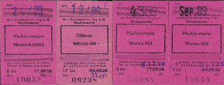 obere Reihe: Zonenorientierte einfache Fahrkarten voller Preis aus a) Pfeddersheim vom 21.08.89, b) Pfeddersheim vom 31.10.89, c) Philippsburg (Baden) vom 02.10.89, d) Philippsburg (Baden) vom 30.08.89 und e) Rheinsheim vom 11.07.89