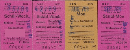 a) Schülermonatskarte aus Oedheim vom Okt/1991, b) Monatskarte aus Oedheim vom Sep/1993, c) Schülermonatskarte aus Oedheim vom Feb/1992 und d) Schülermonatskarte aus Oedheim vom Feb/1993.