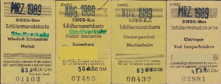 a) Schülermonatskarte aus Neuenstadt (Kocher) vom Nov/1992, b) Schülermonatskarte aus Oedheim vom Dez/1988, c) Schülermonatskarte aus Oedheim vom Mai/1991 und d) Schülermonatskarte aus Oedheim vom Jan/1992.