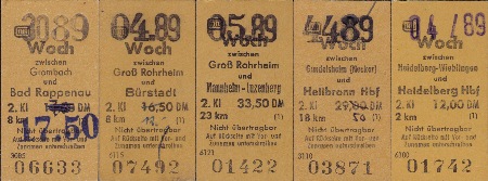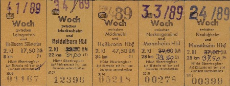 obere Reihe: Zonenorientierte Rückfahrkarten voller Preis aus a) Neckarsteinach vom 28.06.89, b) Offenau vom 18.05.89, c) Richen (b Eppingen) vom 26.05.89, d) Richen (b Eppingen) vom 20.03.89 und e) Philippsburg (Baden) vom 19.06.89.