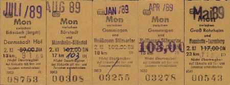 obere Reihe: Zonenorientierte einfache Fahrkarten voller Preis aus a) Bobstadt vom 08.06.89, b) Bruchmühlbach-Miesau vom 17.02.89, c) Buchen (Odenw) vom 21.06.89, d) Buchen (Odenw) vom 27.06.89 und e) Buchen (Odenw) vom 23.06.89.