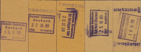 obere Reihe: Zonenorientierte Rückfahrkarten voller Preis aus a) Schwaigern (Württ) vom 28.02.89, b) Seckach vom 24.06.89, c) Seckach vom 23.06.89, d) vom DER-Reisebüro Stadtallendorf vom 10.03.89 und e) Steinsfurt vom 31.03.89.