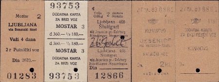 obere Reihe: Zonenorientierte einfache Fahrkarten voller Preis aus a) Richen (b Eppingen) vom 15.11.89, b) Rot-Malsch vom 07.11.89, c) Schwaigern (Württ) vom 23.08.89, d) Schwaigern (Württ) vom 11.12.89 und e) Schwaigern (Württ) vom 12.10.89.