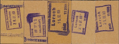 obere Reihe: Zonenorientierte einfache Fahrkarten voller Preis aus a) Leingarten vom 20.06.89, b) Leingarten vom 09.06.89, c) Lorsch vom 11.05.89, d) Lorsch vom 27.02.89 und e) Lorsch vom 12.07.89.