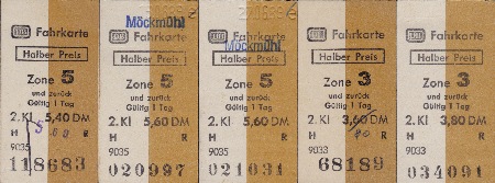 obere Reihe: Zonenorientierte Rückfahrkarten halber Preis aus a) Lorsch vom 14.11.89, b) Lorsch vom 25.10.89, c) Möckmühl vom 28.10.89, d) Möckmühl vom 24.10.89 und e) Möckmühl vom 27.07.89.