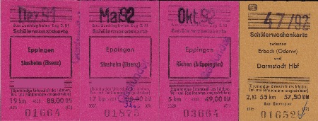 a) Schülermonatskarte Bus/Schiene aus Eppingen vom Dez/1991, b) Schülermonatskarte Bus/Schiene aus Eppingen vom Mai/1992, c) Schülermonatskarte Bus/Schiene aus Eppingen vom Okt/1992 und d) Schülerwochenkarte aus Erbach (Odenw) von der Woche 47/1992.